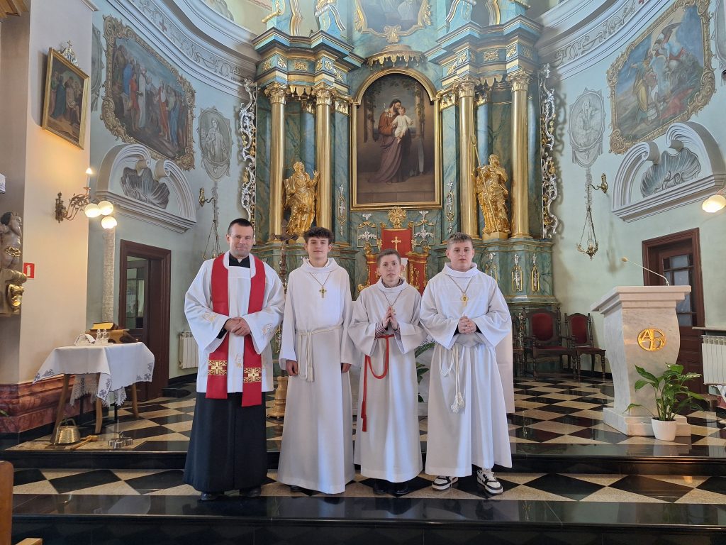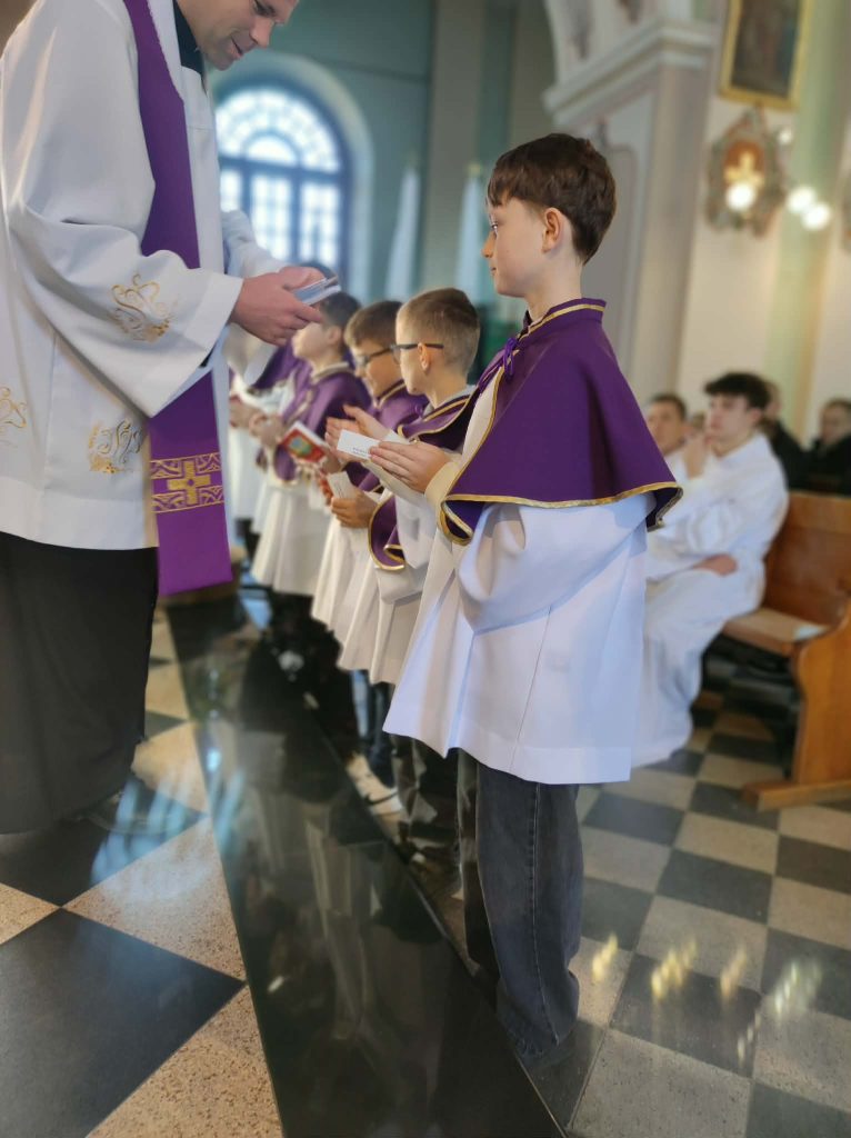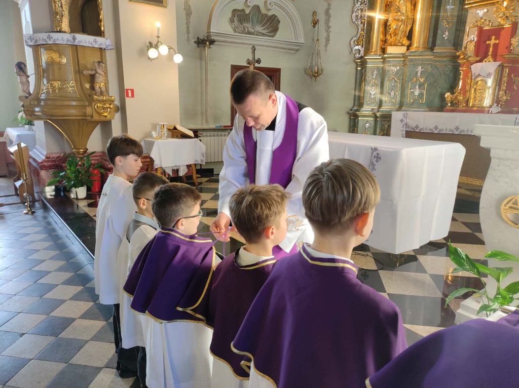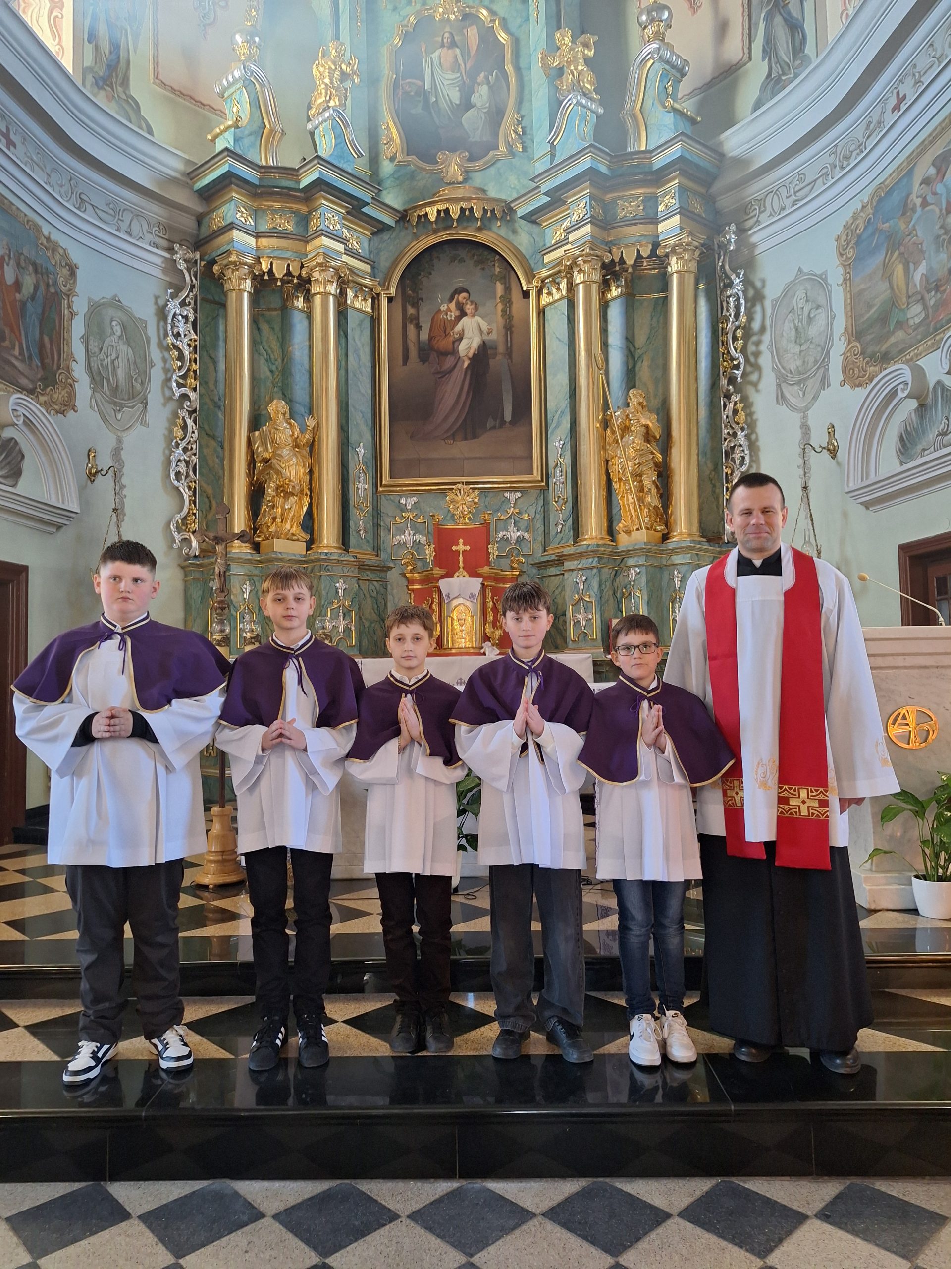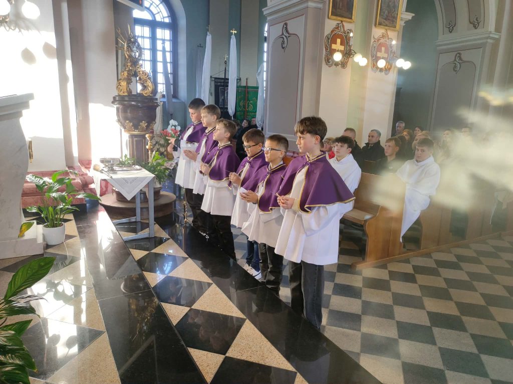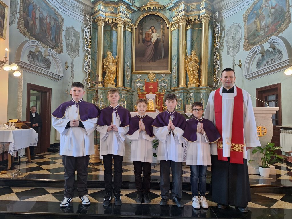 Czwarta Niedziela Wielkiego Postu w Kościele przeżywana jest jako Niedziela Radości z języka łacińskiego „Laetare”. Cieszymy się jako wspólnota Ludu Bożego z bliskości świąt paschalnych, podczas których dokonają się największe tajemnice naszej wiary: męka, śmierć i zmartwychwstania Pana Jezusa. Zgodnie z kilkuletnią tradycją w naszej parafii to także czas radości z włączenia do Liturgicznej Służby Ołtarza nowych ministrantów oraz lektorów Słowa Bożego. Tym razem do wspólnoty ministrantów zostało włączonych 6 kandydatów, zaś do urzędu lektora zostało powołanych 3 kandydatów. Łącznie we wspólnocie LSO przybyło 9 nowych ministrantów i lektorów, co było okazją do wielkiej radości dla całej parafii. Cieszymy się, że chłopcy odznaczyli się kompetencją, wiedzą i wytrwałością w służbie Bożej, czego finałem było uroczyste przyjęcie. Gratujemy zarówno nowym ministrantom jaki i lektorom! Podziękowania kierujemy również do rodziców ministrantów i lektorów, dziękując za współpracę i zaangażowanie ich dzieci w posługę przy Kościele. Nowym ministrantom i lektorom życzymy niegasnącego zapału i radości płynącej ze Służby Bożej. Zapraszamy równocześnie nowych kandydatów do posługi ministranckiej z naszej parafii. Szczegółowe informacje dotyczące zapisu na ministranta u ks. Pawła.