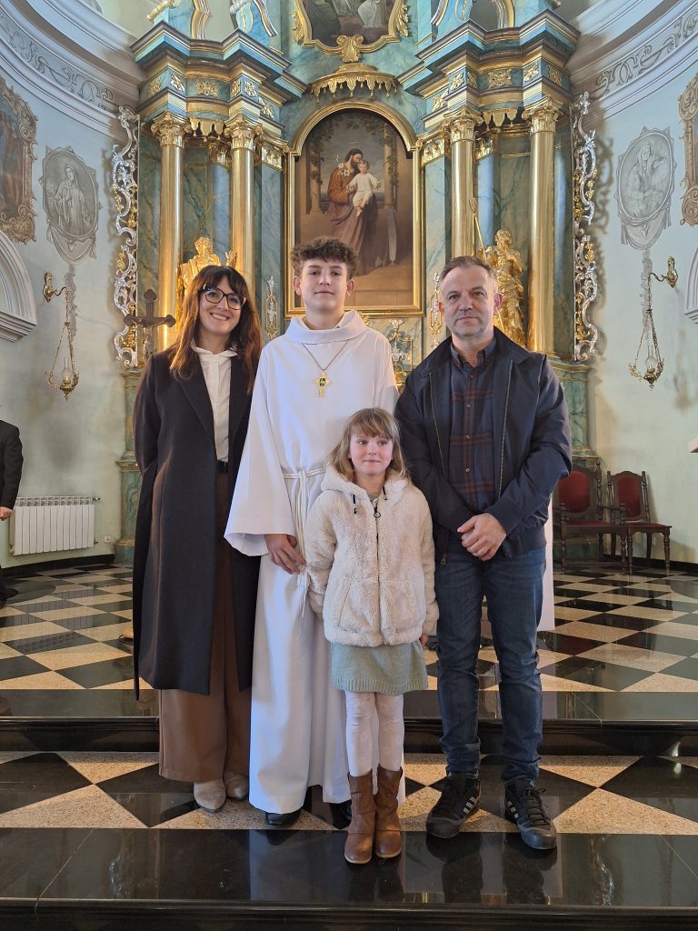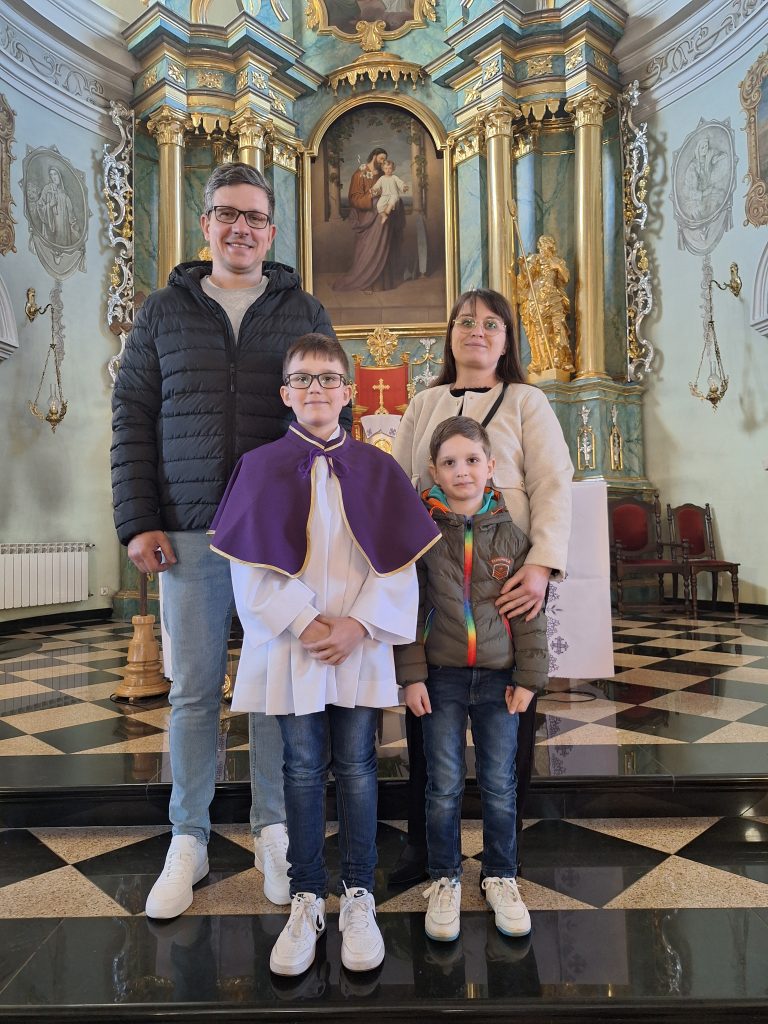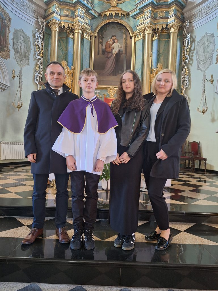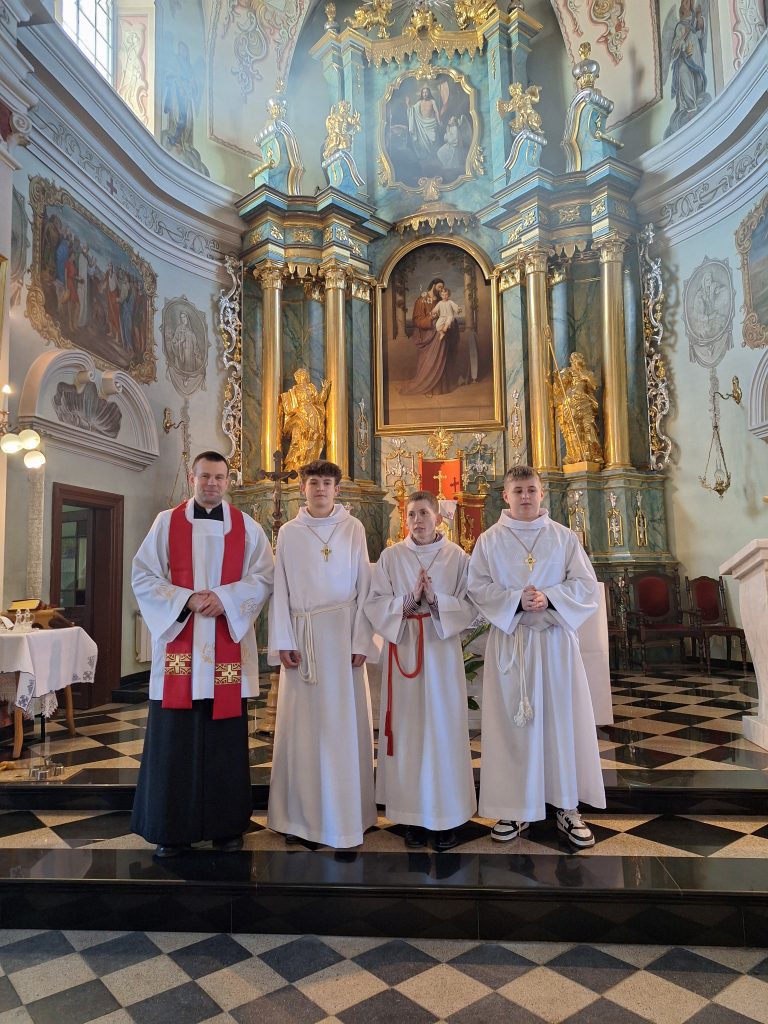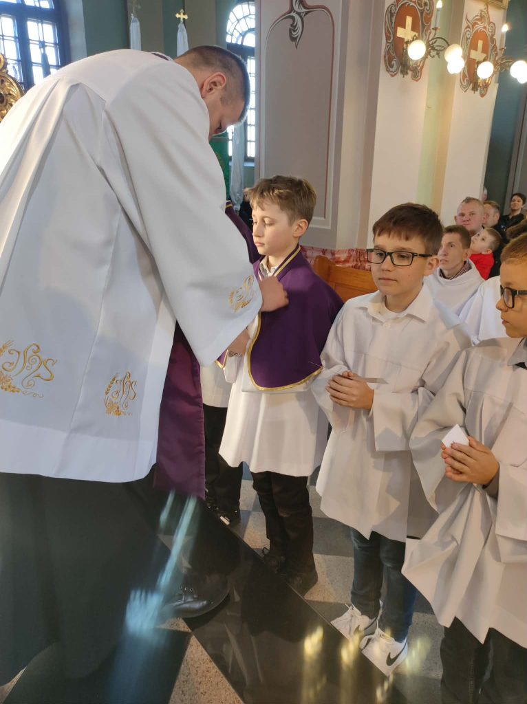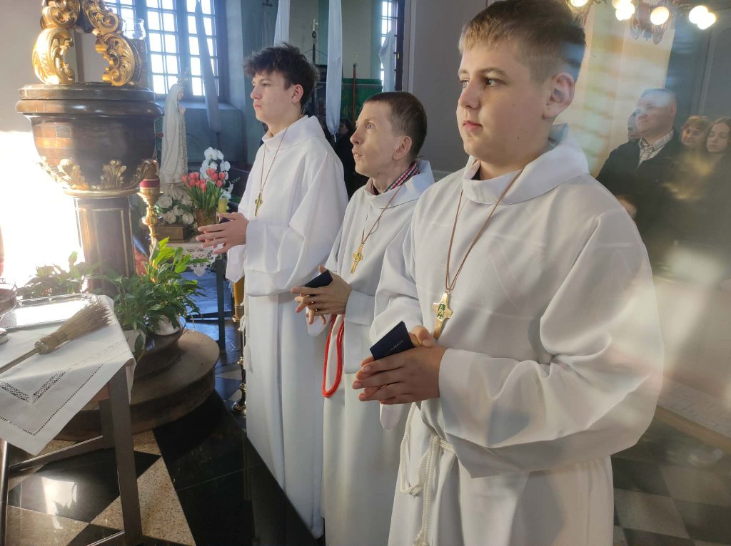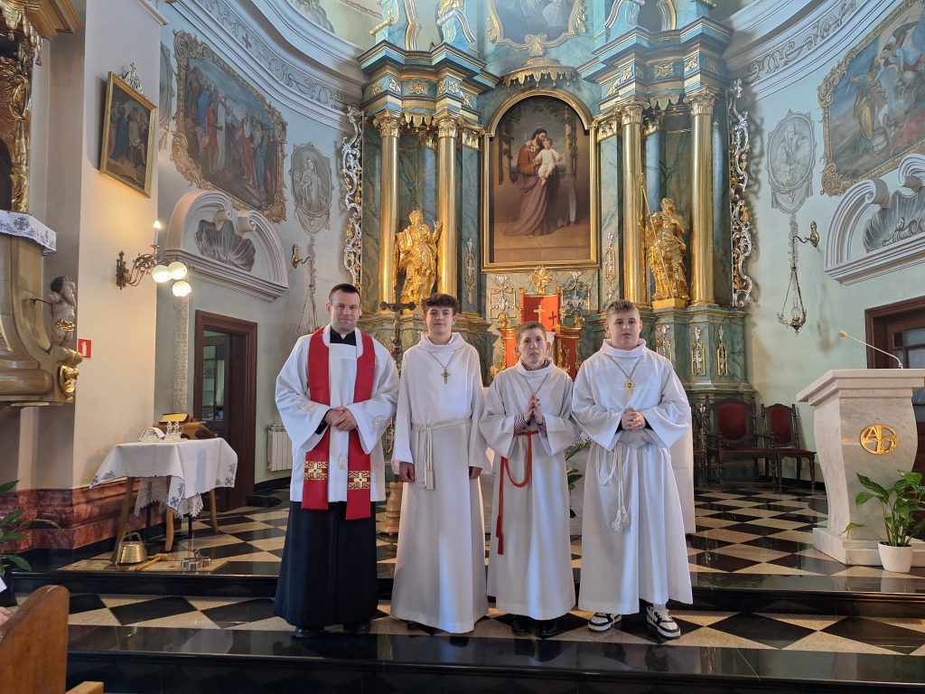 Czwarta Niedziela Wielkiego Postu w Kościele przeżywana jest jako Niedziela Radości z języka łacińskiego „Laetare”. Cieszymy się jako wspólnota Ludu Bożego z bliskości świąt paschalnych, podczas których dokonają się największe tajemnice naszej wiary: męka, śmierć i zmartwychwstania Pana Jezusa. Zgodnie z kilkuletnią tradycją w naszej parafii to także czas radości z włączenia do Liturgicznej Służby Ołtarza nowych ministrantów oraz lektorów Słowa Bożego. Tym razem do wspólnoty ministrantów zostało włączonych 6 kandydatów, zaś do urzędu lektora zostało powołanych 3 kandydatów. Łącznie we wspólnocie LSO przybyło 9 nowych ministrantów i lektorów, co było okazją do wielkiej radości dla całej parafii. Cieszymy się, że chłopcy odznaczyli się kompetencją, wiedzą i wytrwałością w służbie Bożej, czego finałem było uroczyste przyjęcie. Gratujemy zarówno nowym ministrantom jaki i lektorom! Podziękowania kierujemy również do rodziców ministrantów i lektorów, dziękując za współpracę i zaangażowanie ich dzieci w posługę przy Kościele. Nowym ministrantom i lektorom życzymy niegasnącego zapału i radości płynącej ze Służby Bożej. Zapraszamy równocześnie nowych kandydatów do posługi ministranckiej z naszej parafii. Szczegółowe informacje dotyczące zapisu na ministranta u ks. Pawła.